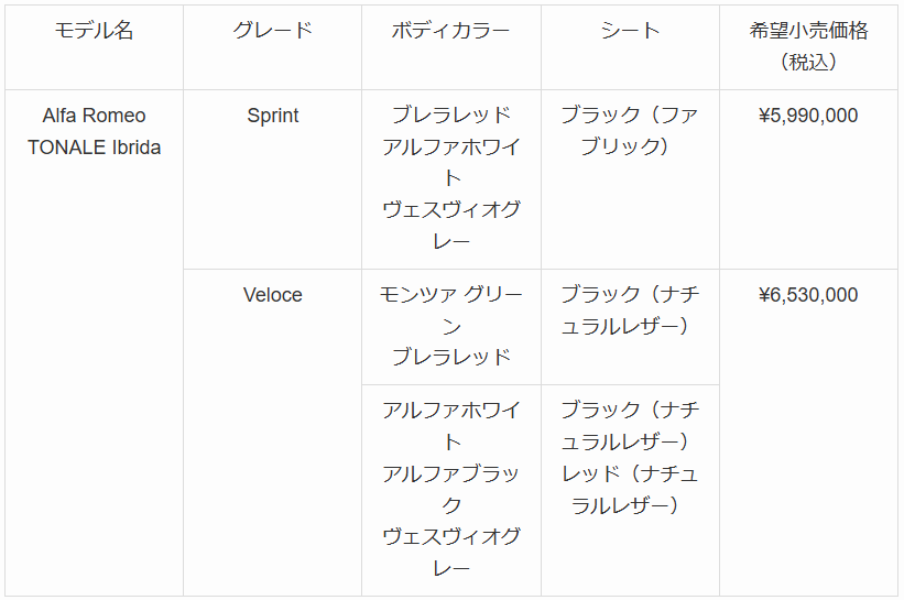 新型「TONALE」価格表