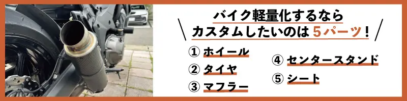バイクの軽量化を狙ってカスタムする際、一定の効果が見込めるパーツはホイール・タイヤ・マフラー・センタースタンド・シートの5つです。