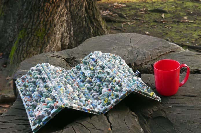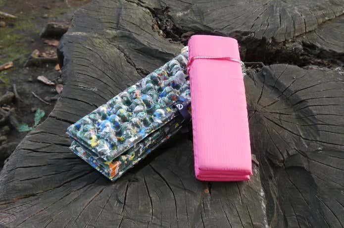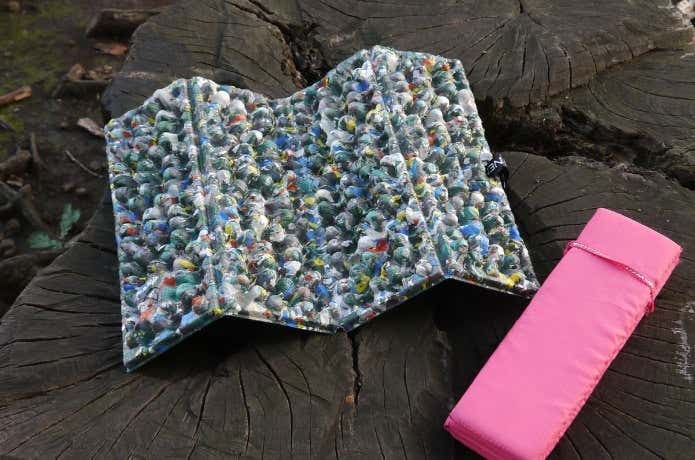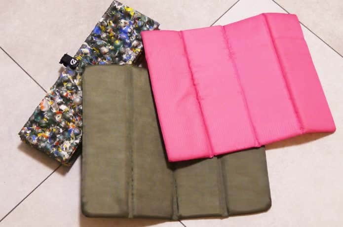 斬新な発想の登山・キャンプ用品を展開するニーモ。こちらはクローズドセルフォームパッドを製造する際に出る端材を再利用して作られた、サスティナブルな座布団です。製品によって色の出方に違いがある個性的な一品。