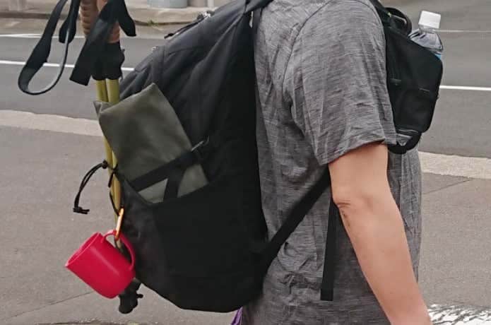 持ち歩く時間のほうが長くなるのでパッキングは重要。ザックから大きくはみ出さないサイズであれば、取り出しやすいサイドポケットに入れたりバンジーコードに挟んだりしておくと便利です。ザックを開けない小休憩でもサッと取り出せるので、使う回数もアップします。