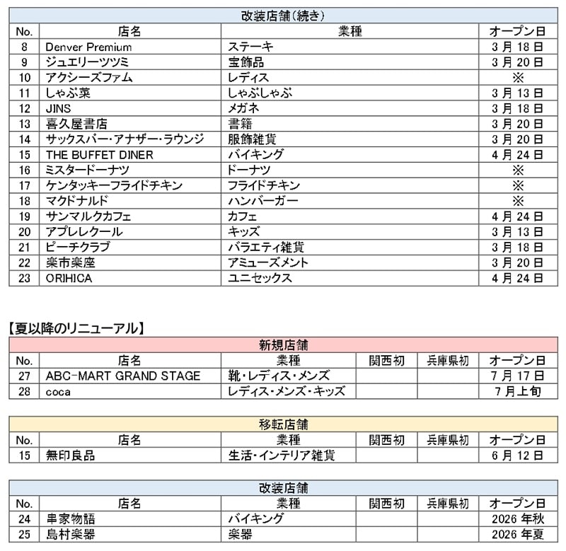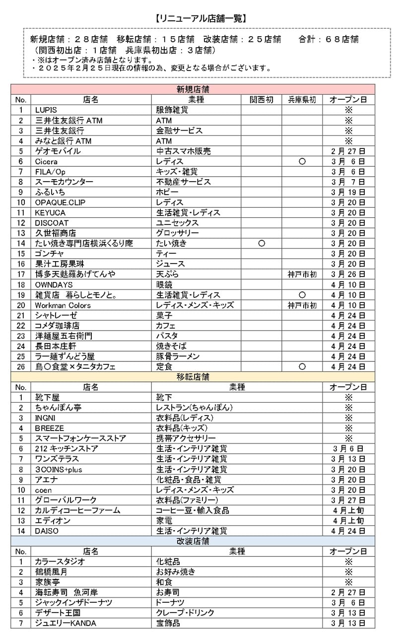 「イオンモール神戸北」リニューアル店舗一覧(68店舗)