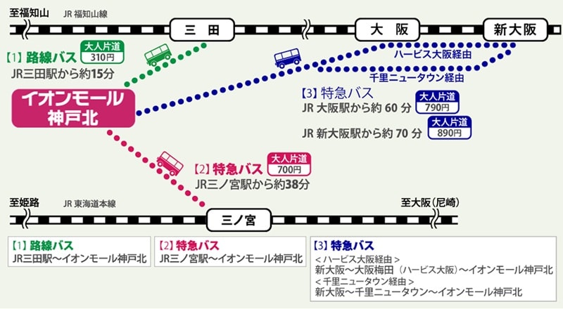 公共交通機関を利用する場合、JR「三田駅」から路線バスで約15分、特急バスを利用する場合はJR「三ノ宮駅」から約38分、JR「大阪駅」から約60分、JR「新大阪駅」から約70分目安でアクセスが可能です。