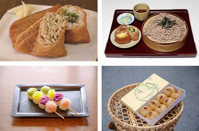 門前通りでは、胡桃入りや蕎麦入りなど個性的ないなり寿司や、和スイーツの食べ歩きも楽しめます。歩いたあとのご褒美にもぴったりです。