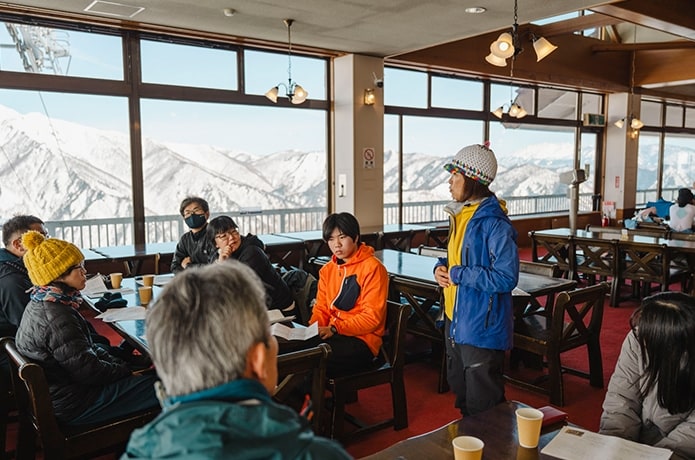 入門編は、座学と実技を組み合わせたプログラム。まずは、ロープウェイ天神平駅直結の展望レストラン『ビューテラスてんじん』で冬山の気象や雪崩の基礎、装備の考え方などを学んでいきます。