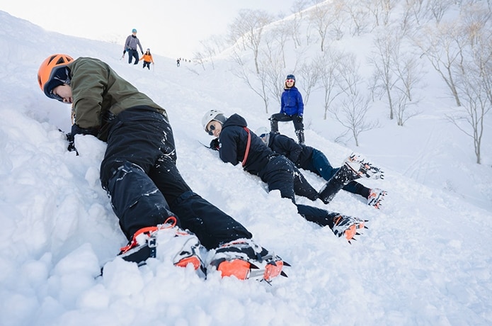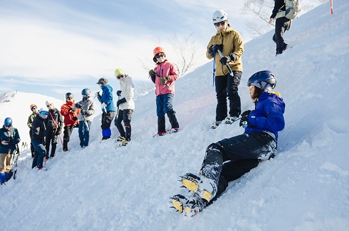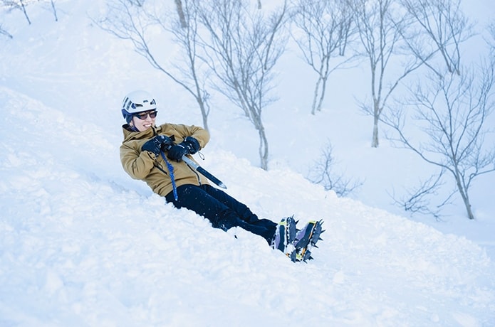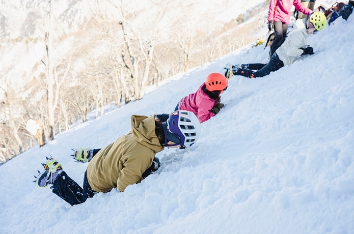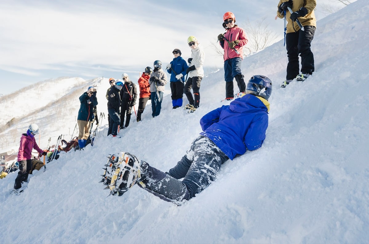 最後に、イレギュラーな状況への対応として滑落停止方法をガイドの実演とともに学びます。