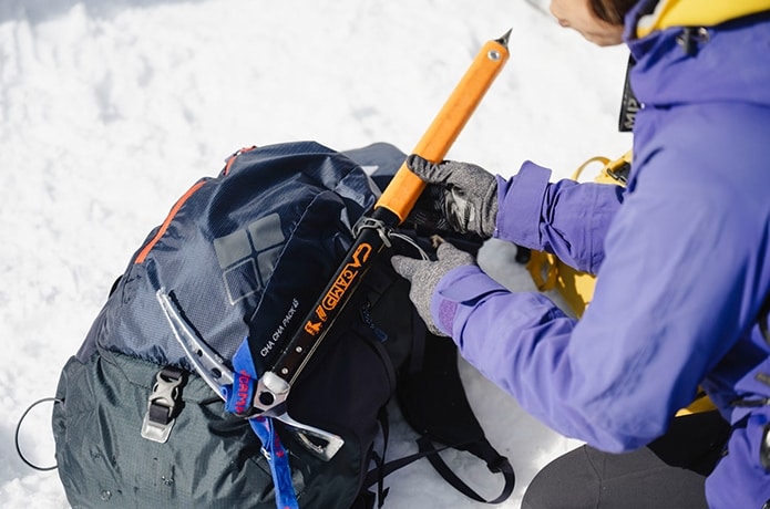 続いては、ピッケルの持ち方や構え方、ザックへの取り付け方法まで丁寧にレクチャー。単に持っているだけでなく、状況に応じて正しく扱えることが重要だと教わります。