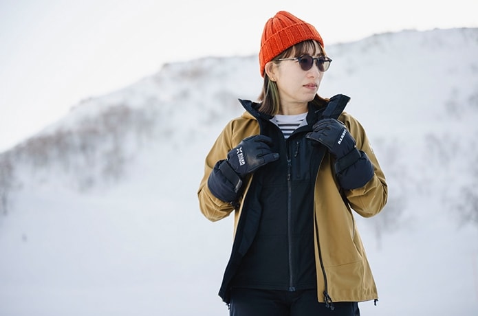 さらに、レイヤリングの考え方やガイドが実際に愛用している装備をその場で披露。グローブやシェル、雪山ならではのギアまで、製品名も交えて具体的に解説してくれます。
