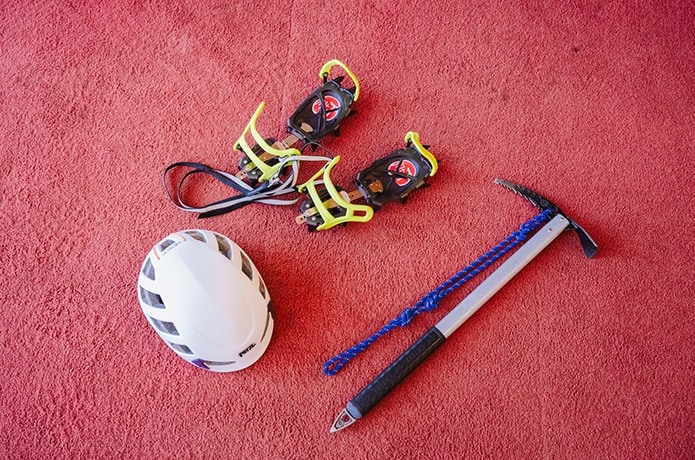 ヘルメット・アイゼン・ピッケルは、雪山登山スクールで使用する基本装備。