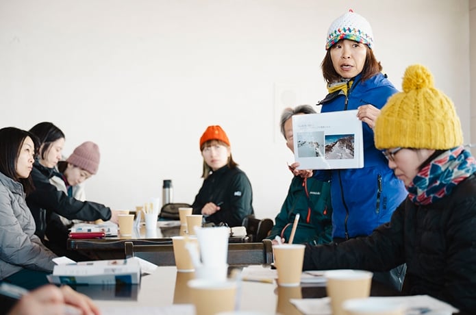 座学は、思わず誰かに話したくなる谷川岳の雑学からスタート。場の空気がほぐれたところで、冬山特有の気象変化や雪崩の仕組みへと話は深まります。