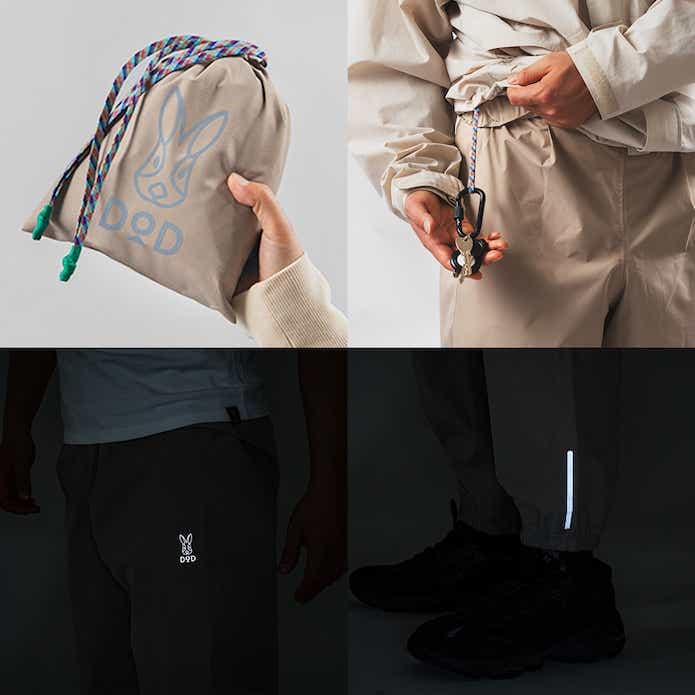 裾と腿にはリフレクタープリントを施し、自動車からの視認性にも配慮されています。使いやすさを考えたディテールもポイントです。