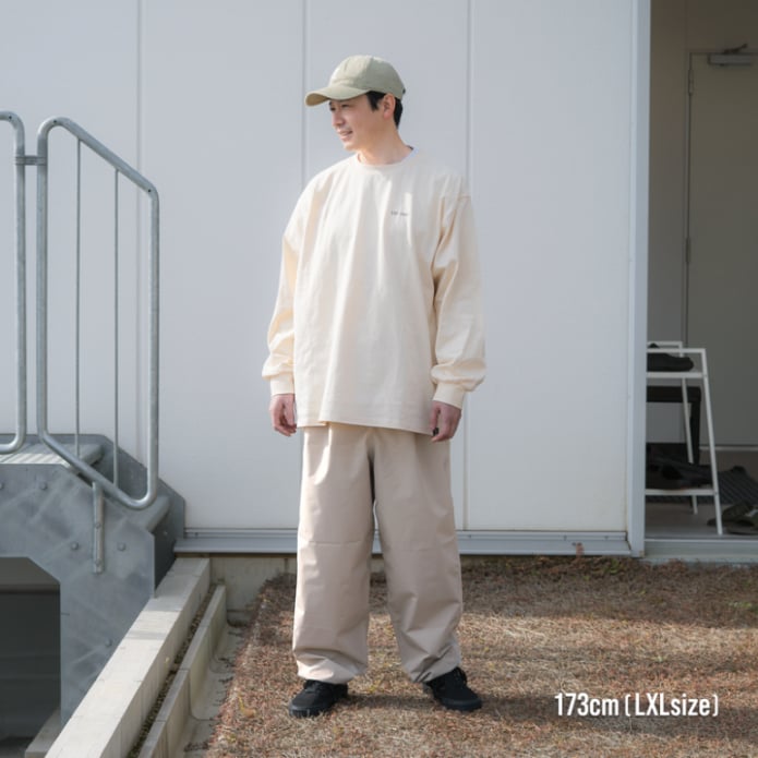 レインパンツというと野暮ったい印象を持つかもしれませんが、こちらは腰まわりにゆとりを持たせたテーパードシルエット。