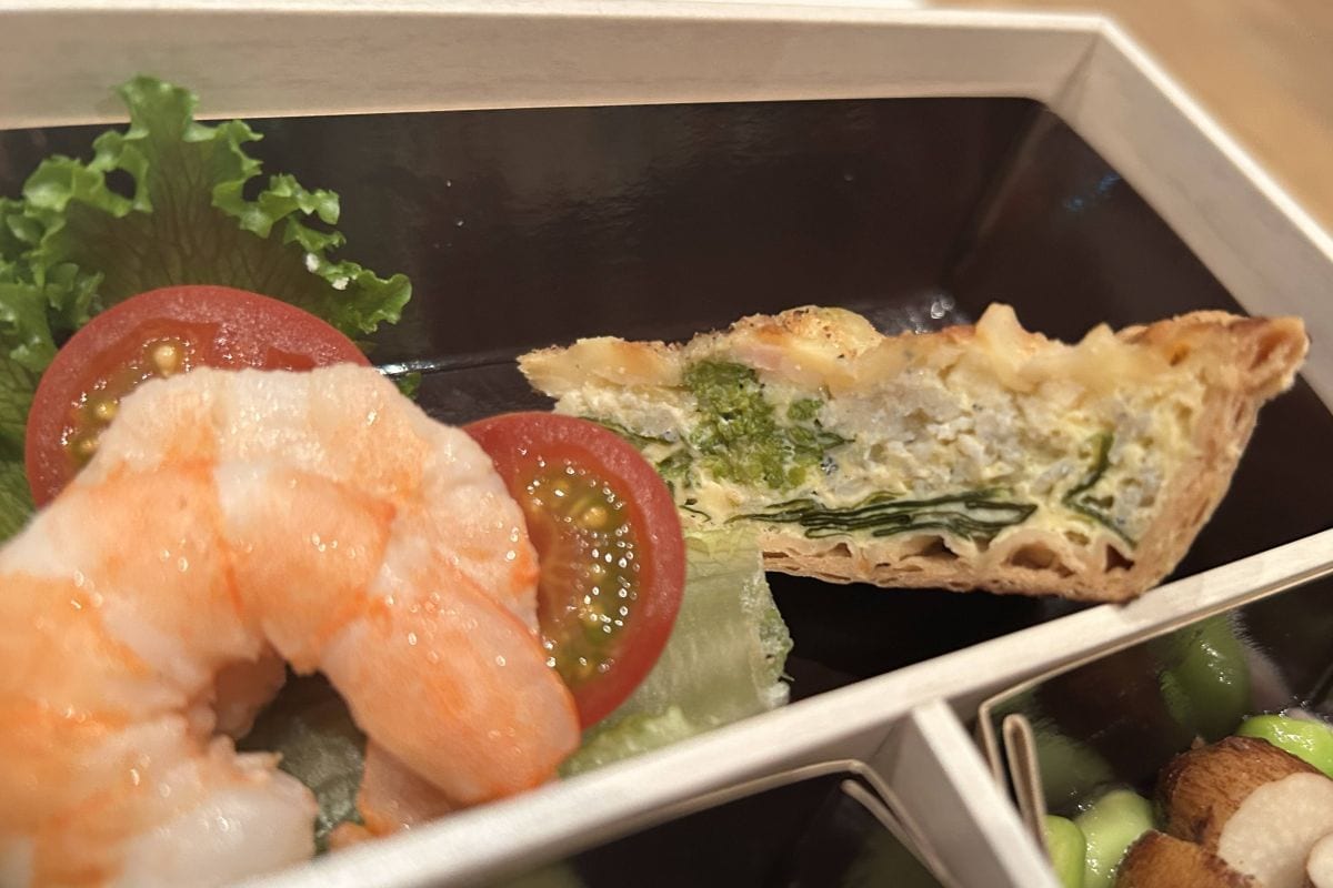 「ワカメとシラスのキッシュ」は、ワカメのさっぱりさと、シラスの食感が楽しく、上品に海を感じる一品でした。添えられているサラダにはえびが入り、こちらも海を感じます。