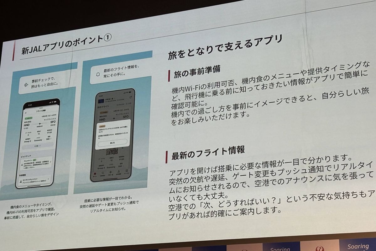 4月から登場する新しいJALアプリでは従来の機能に加え、例えば、機内でWi-Fiが使えるのか、機内食はどういったタイミングで提供させるのか、といったより詳しい旅の事前情報がアプリで確認できるようになったり、遅延やゲート変更といった搭乗の直前に必要な情報が充実するそうです。