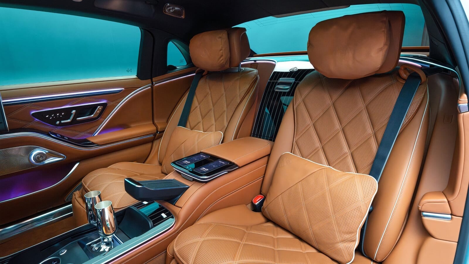 さらに重要なのは後席だ。2脚の肘掛け椅子スタイルのシートに加え、個別の13.1インチディスプレイが備わり、リモコン付きのセンターコンソールも一新された。カップホルダーは、付属のシルバーメッキ製「Robbe & Berking」社製シャンパングラスにジャストフィットする。