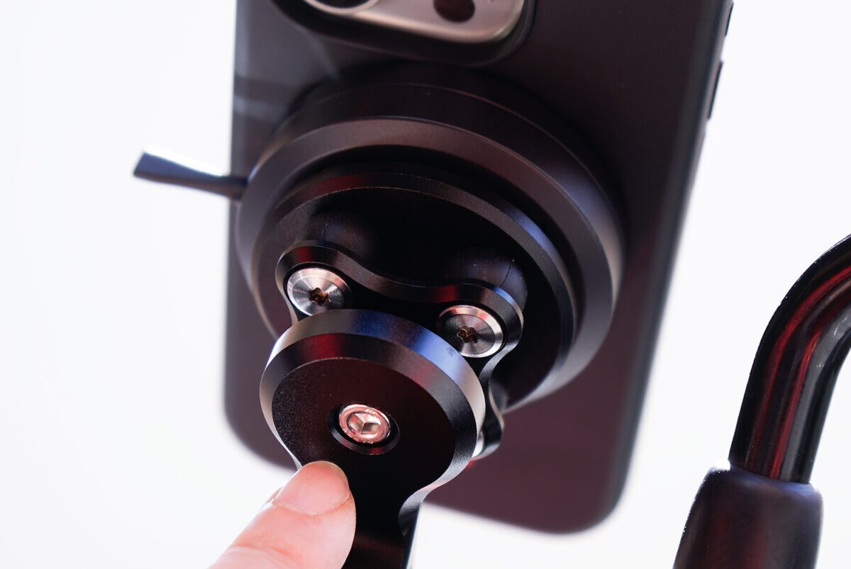 そしてスマホ本体の向きを360度自由に変えることができるのも大きなポイント。しかも、工具を使ったり調整ネジを回さなければいけない製品が多い中、GRエクスプロアは手間も工具も一切不要。ただ手でスマホを回すだけの簡単調整が可能なのだ(動画あり)。