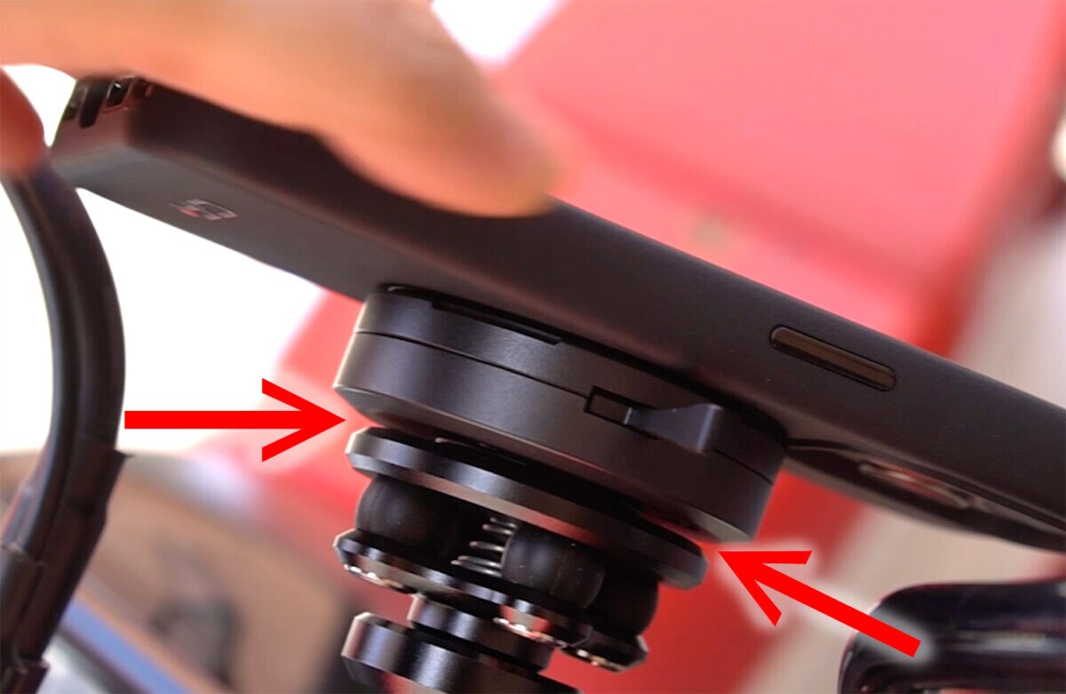 マウントと専用フォンケースやスマホケースに貼り付けられるユニバーサルアダプタに備わるマグネットにより、スマホをマウントに近づけるだけで暗がりでも位置を探ることなく正位置にピタッと吸着でき、少しのヒネリで2本のツメがアダプタ側の溝をカチッと完全ホールド。脱着が簡単なだけじゃなく、落下の心配もないのだ。
