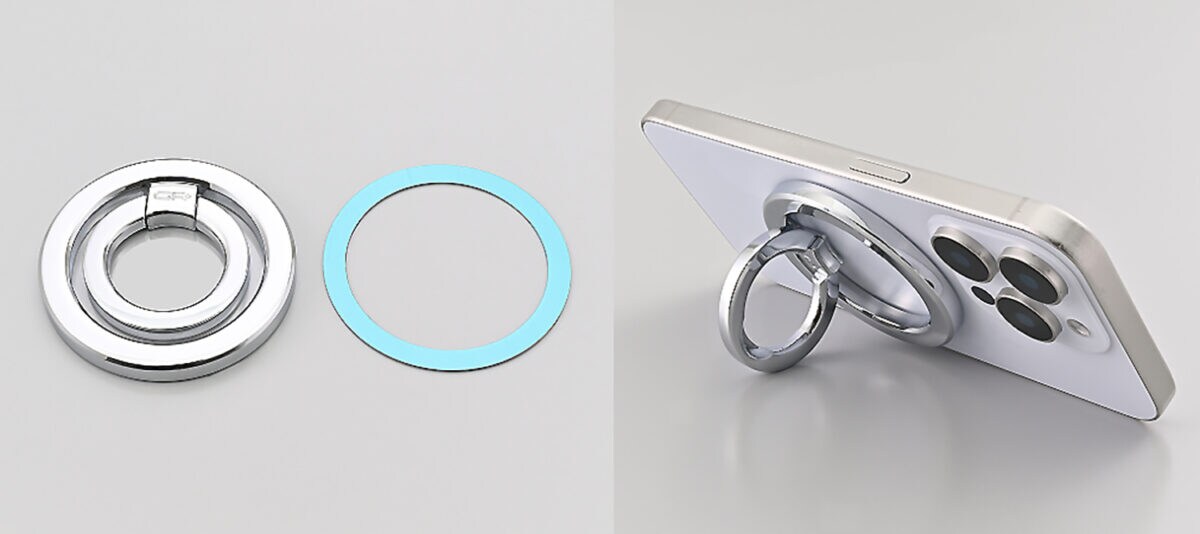 スマホケースの裏に付けて使用するGRのロゴ入りリングホルダー。マグネットでの装着なので簡単に脱着ができ、中央のリング位置を変えればスタンドとしても使用できる。