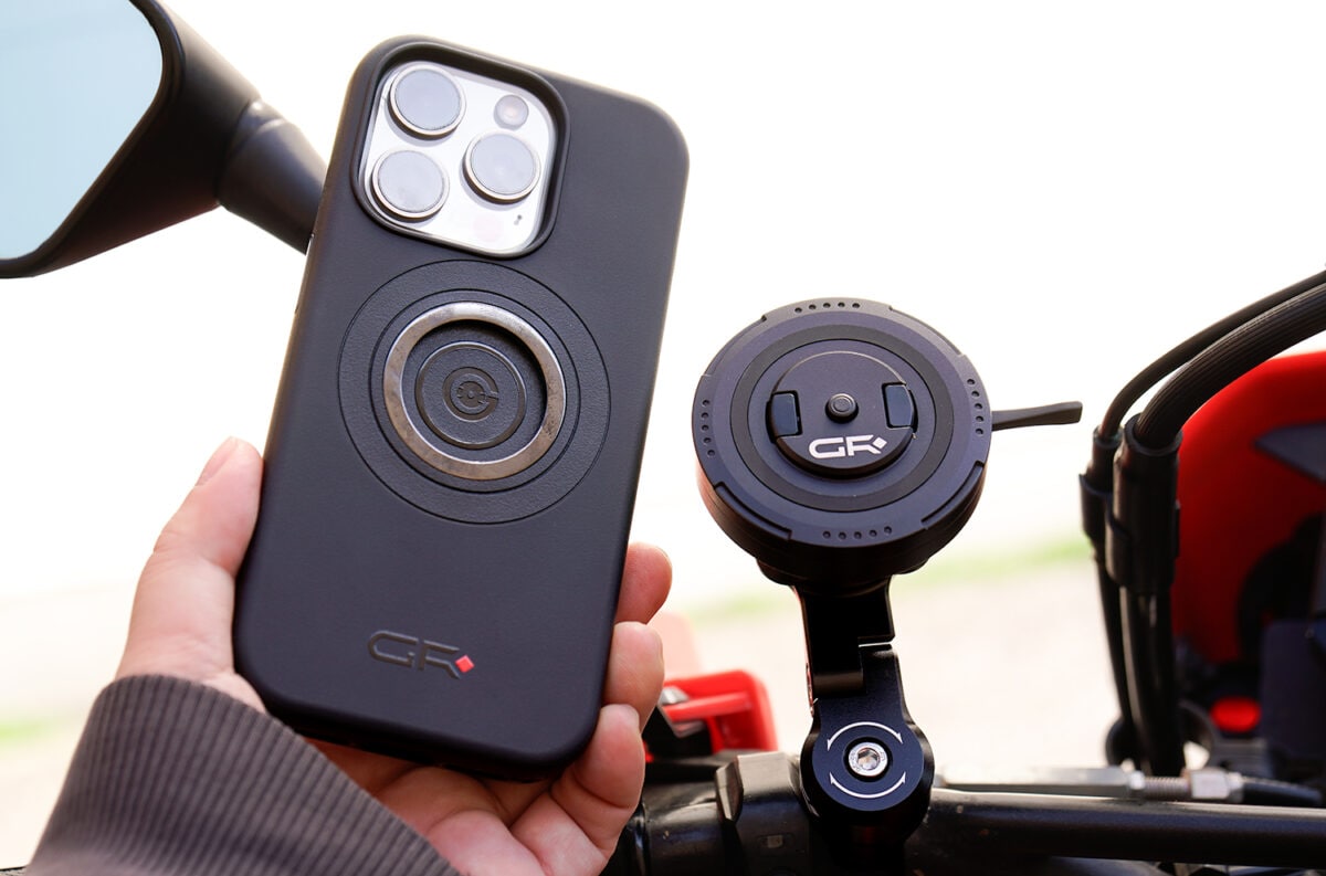 走行前の準備や休憩時の取り外しはもちろん、この瞬間のこの風景をスマホで撮りたい! とバイクを停めて急いでスマホを構える。そんな刹那のタイミングにも即対応できる脱着のスムーズさは圧巻。