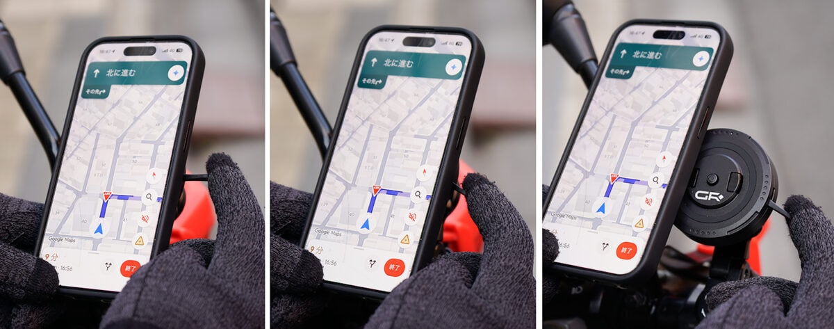しかしっ、GRエクスプロアのマウントはグローブをしたままでも扱いやすく、ツーリング中の休憩時や雑多な観光スポットのそばでササっとスマホで写真撮影をする際にもまったくストレスを感じなかった。