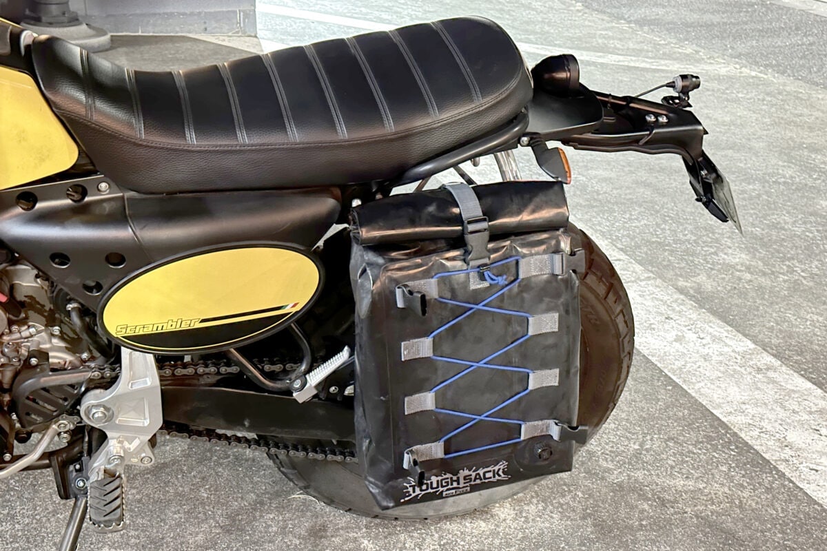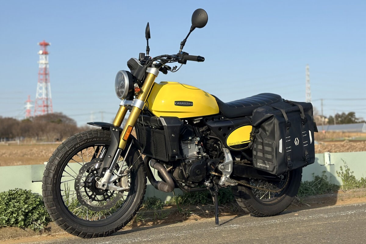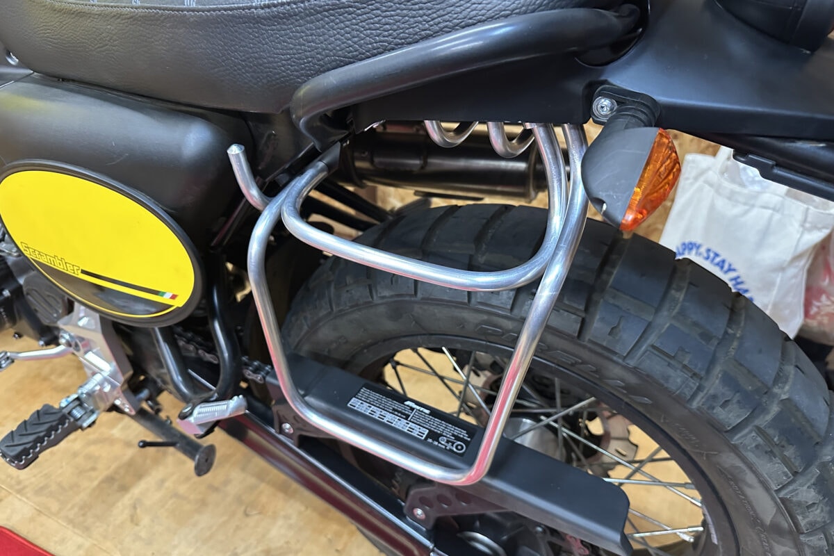 テスト車両のファンティック・キャバレロ・スクランブラー500は、小振りなサイドバッグを装着するためワンオフのサイドバッグサポートが装備されている。今回はそれを利用して取り付けてみた。