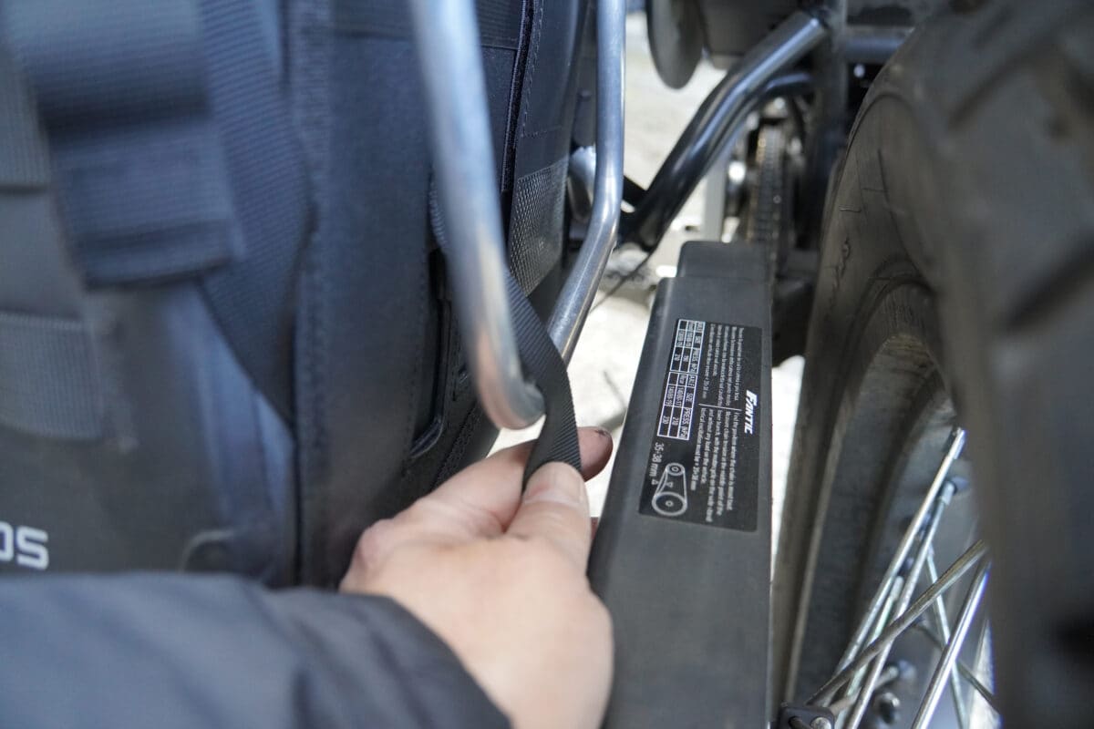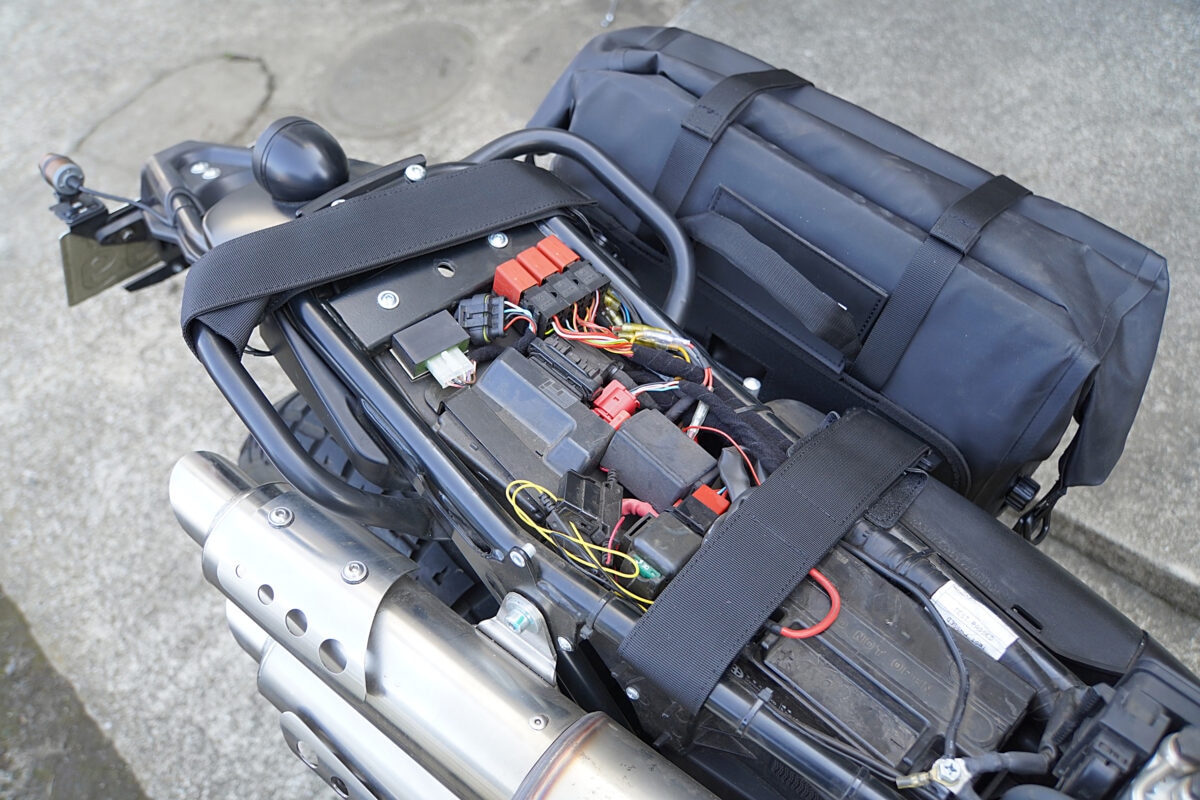 シートを外して、サイドバッグに装着したユニバーサル固定ストラップをフレームとグラブバーに通して固定。ストラップは強力な面テープで長さを自由に調整できるので、位置決めがしやすい。
