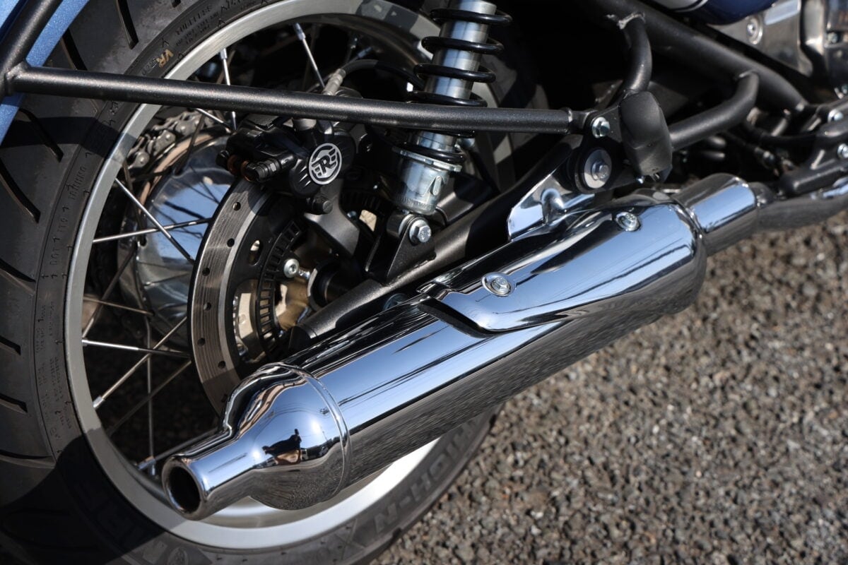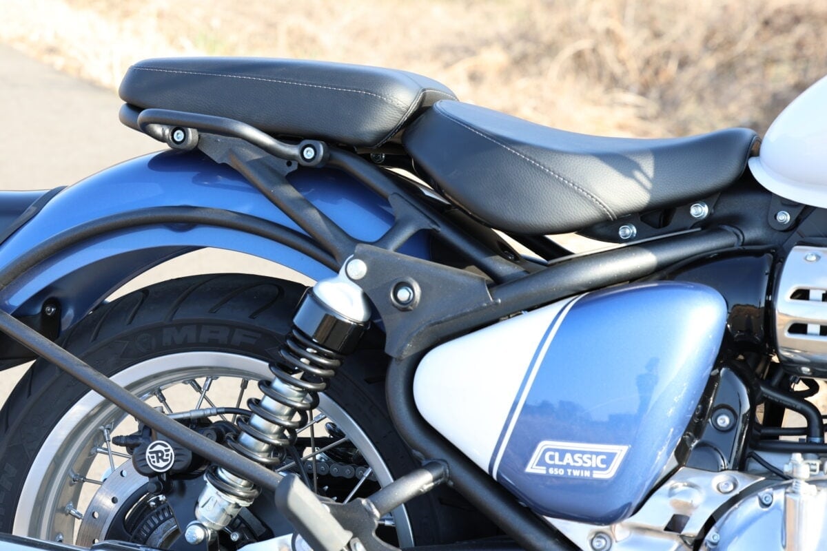 加えて650シリーズの魅力は、“オーナーの感性でさらに愛車をオリジナリティをアップさせられるところ”だとか。ロイヤルエンフィールド千葉店の試乗車は二人乗りが可能なダブルシート仕様になっていたが、実はボルトを数本外すだけでシングルシートのスタイリングも手に入る。