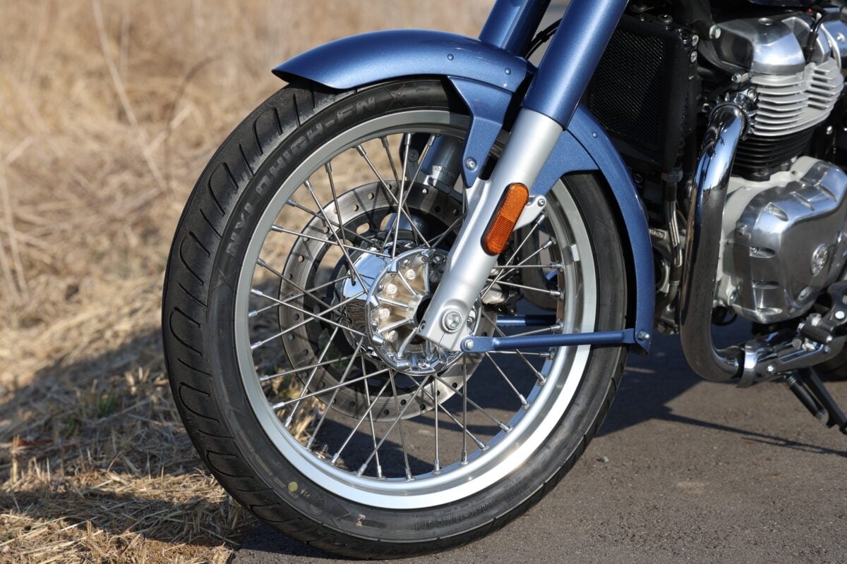 一番の違いはフロントの足回り。兄弟モデルが高剛性な倒立フォークを採用するのに対し、クラシック650は正立フォークを採用。またフロントタイヤの外径を大きくなっていることで直進安定性は増しているものの、ワイヤースポークホイール&正立フォークで程よい車体のしなやかさを創出。
