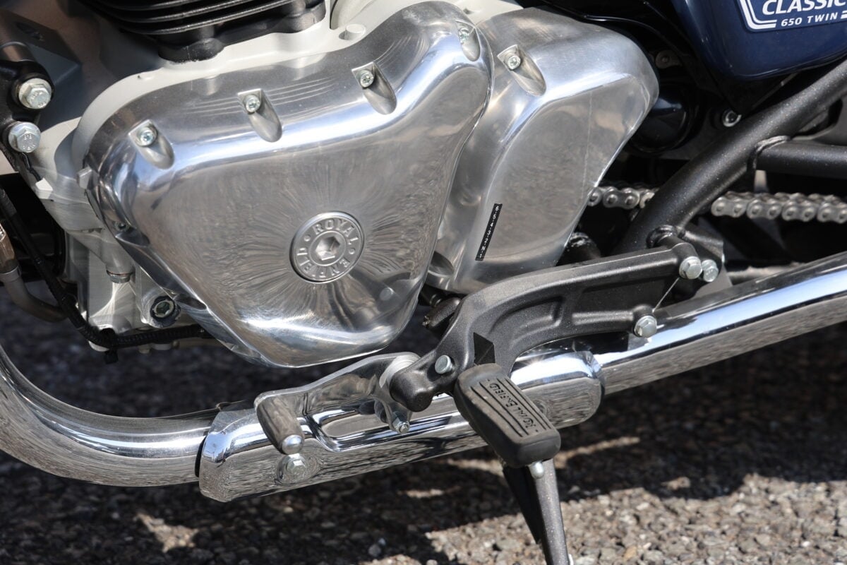 クラシック650が搭載するのは今どき珍しい空冷エンジンの648cc並列2気筒。純粋なバーチカル(直立)レイアウトではなく若干シリンダーを前傾させており、クランクレイアウトは時流の270°位相クランクを採用。90°Vツインのような歯切れのいい鼓動感と低速でエンストしにくいようなトルク特性でありながら、スロットルを回せばしっかり高回転まで吹け上がるようになっている。“試乗された方の中にはこの並列2気筒エンジンの鼓動感に惚れ込まれる方も多いです”とのこと。
