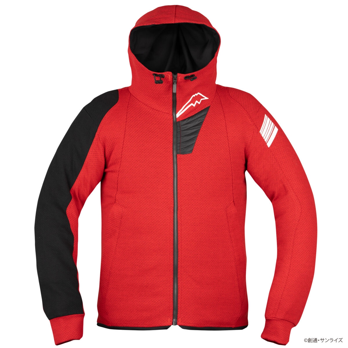 KUSHITANIが独自開発した、ダイヤ状の凹凸感を持つ肉厚な綿タッチ素材を採用しています。裏面にも凹凸構造を設けることで肌との接触面積を軽減し、快適な着心地に配慮しました。人気のフードデザインはそのままに、右袖を配色仕様とすることでスポーティな印象を高めています。『機動戦士ガンダム閃光のハサウェイキルケーの魔女』モデルは、マフティーをイメージしたネイビー×ブラックのカラーリングを採用し、背面にはマフティーマークを大きく配置。『機動戦士ガンダム』モデルは、シャアをイメージしたレッド×ブラックのカラーリングとし、背面にシャアマークを大胆にレイアウトしたデザインとなっています。