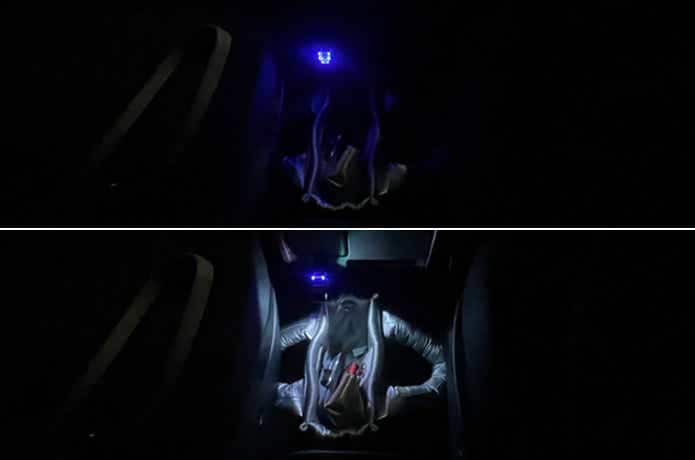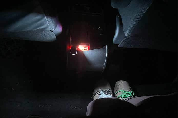 実際、運転席や助手席って、ダッシュボード周辺機器の光のせいで、足元以外はそこそこ明るいですよね。対する後部座席は、走行中は本当に真っ暗です。