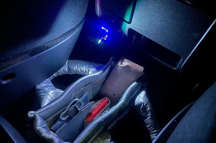 ですが、ちょうど左右をシートに挟まれてLED部分を目視しづらい場所なので、シフトレバー上の小物ポケットにモバイルバッテリーを置き、そこへ「スイングUSB」をセット。