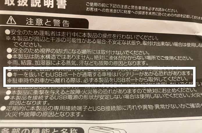 もう1つ気になったのが、USBポートに挿しっぱなしだと、車種によってはバッテリーがあがってしまうリスクがある点です。