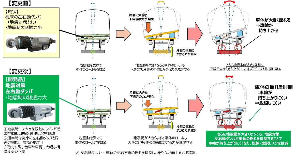地震が発生して車体が左右に大きく揺さぶられると、最終的に車輪がレールから持ち上がり、脱線や逸脱につながる危険性があります。新しいダンパはこの揺れを強力に抑制し、車輪が持ち上がりにくくすることで、脱線リスクを最大約5割も低減させることに成功しました。