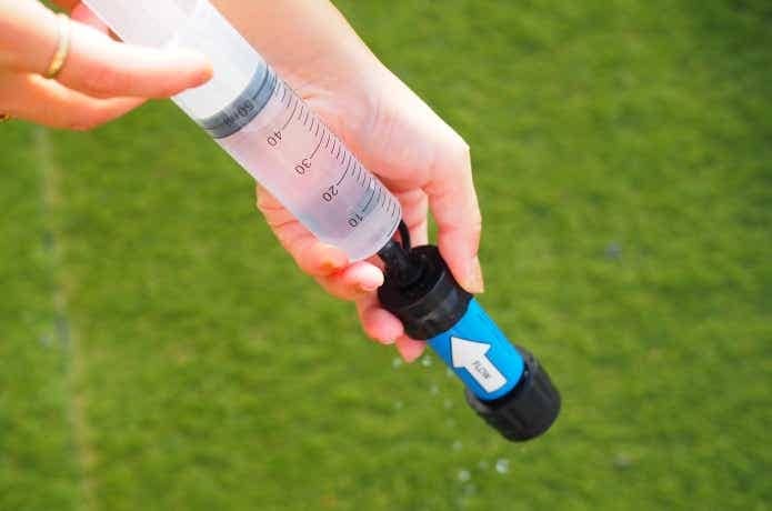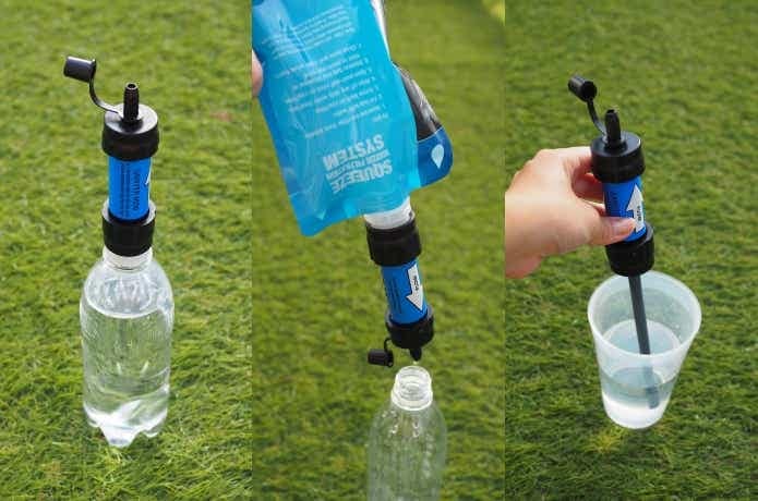 使い方はシンプルで、付属のパウチやペットボトルに取り付けて水を押し出すだけ。0.1ミクロンの中空糸膜フィルターが細菌や原虫などを除去し、安全な水へと変えてくれます。