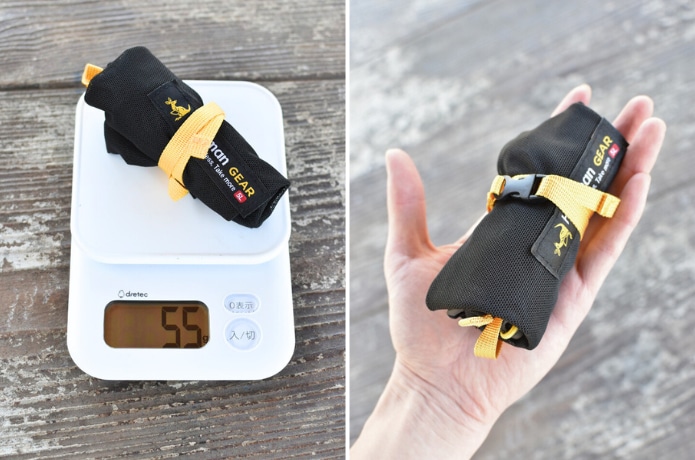 重さは約55g(実測)と軽量で、折りたたむとコンパクトに。ザックに忍ばせておいて、必要なときだけ取り出す使い方もおすすめ。