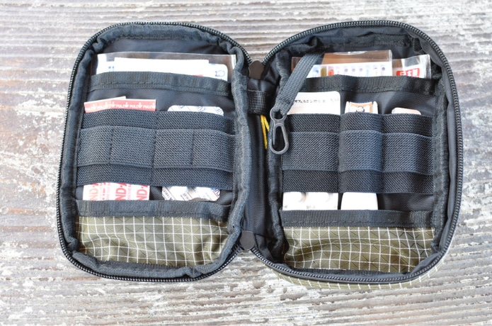 ガバッと大きく開く構造で、中身がひと目で確認できるのが特徴。ファーストエイドキットや予備電池、カイロなど、小物類をまとめて管理できます。