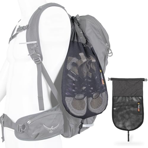 ザックに装着できるシューズ収納ポーチ。使用後の靴もサッと取り出してそのまま仕舞えば、内部と分けて持ち運べます。下部バックルで固定できるため揺れにくく、歩行中も快適。通気性の高いメッシュ素材で蒸れを防ぎ、自然乾燥も可能です。サイズ調整や折りたたみにも対応し、軽量で携行しやすく多用途に活躍します。