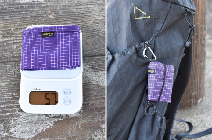 折りたたむとコンパクトになり、重さも57g(実測)と軽量。ザックに忍び込ませることはもちろん、付属しているカラビナもを使えば外付けすることもできます。