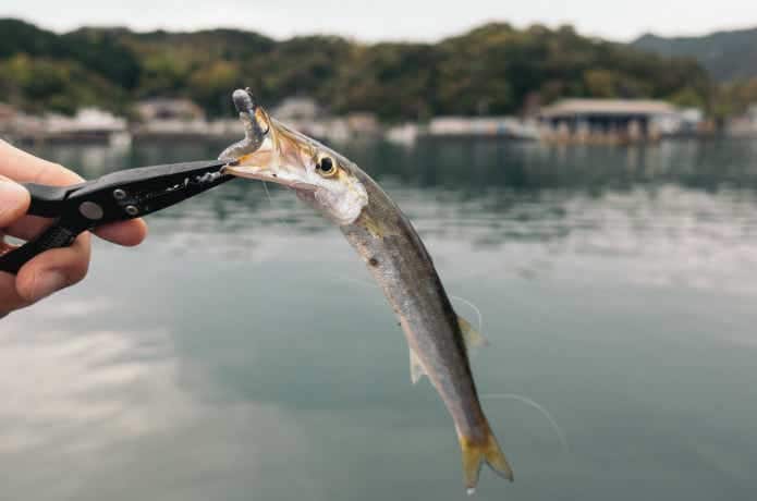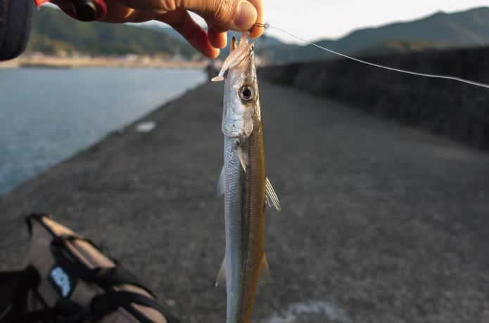 色々と使い心地を探っているとカマスがヒット! この日はカマスが大当たりだったようで、リングキックテイルだけで20匹ほど釣れました。
