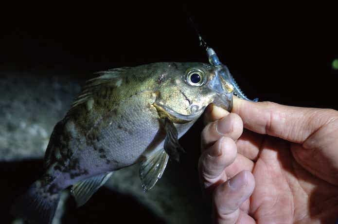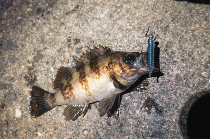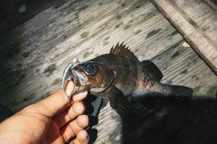 ストラクチャー周りやイマイチ潮が効いていない場所では、ワームをちぎってサイズを小さくして、ジグヘッドも軽くしてやると永遠と小メバルが釣れ続きました。