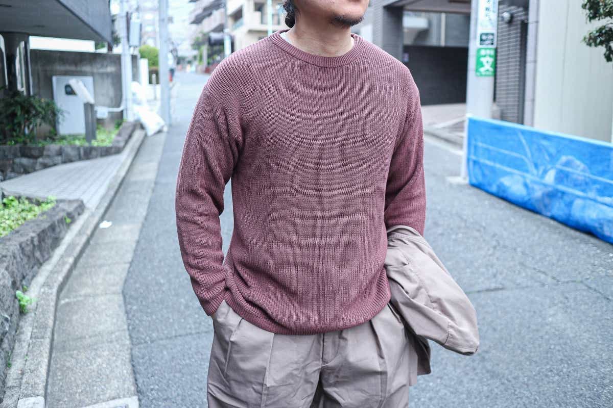 インナーのクルーネックセーター(3,990円)は、ざっくりとした編み目が豊かな表情を見せるコットンローゲージニット。通気性の良さとほどよい保温性を兼ね備えており、これからの季節に重宝する一枚です。