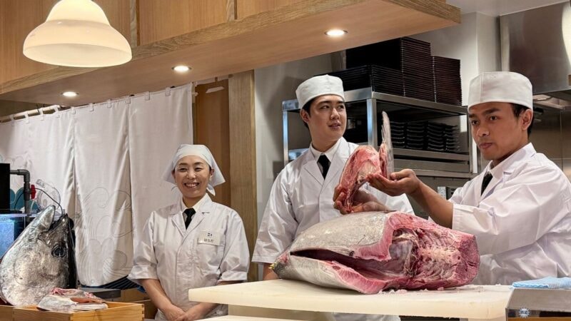 その日に一番美味しい魚を日替わりで提供しますが、目玉はやっぱり「まぐろ」。取材時には福島県いわき市の小名浜港で延縄漁によりあがったまぐろの解体ショーが行われ、解体したまぐろが振る舞われました。