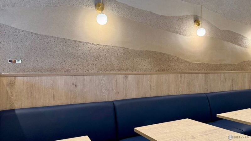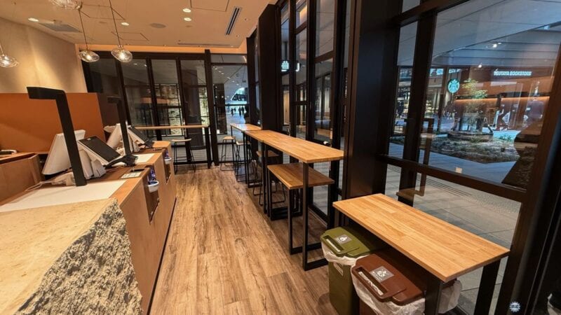 内装にも注目、カウンター天板には生産工程で廃棄されるコーヒー豆を再活用したり、床にはタマゴの殻を再利用したバイオマス素材を採用したり、店内のいたるところにリサイクル素材を活用しており、シックで落ち着いた空間であるとともに、サステイナブルな取り組みを身近に感じることができます。