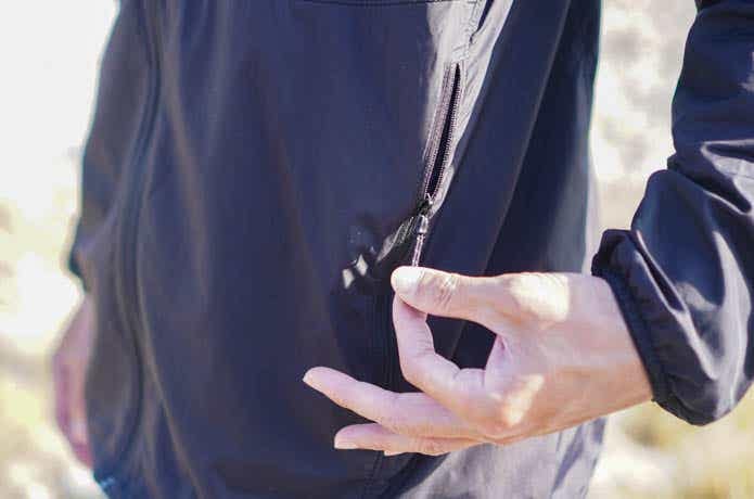 ポケットは腰に2つ、さらに左胸にスマホや財布が収まりそうなポケットを1つ備えています。いずれもジッパー付きなので、収納したものの落下防止にも役立ちます。