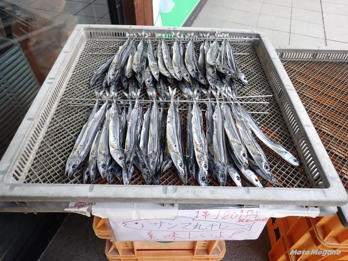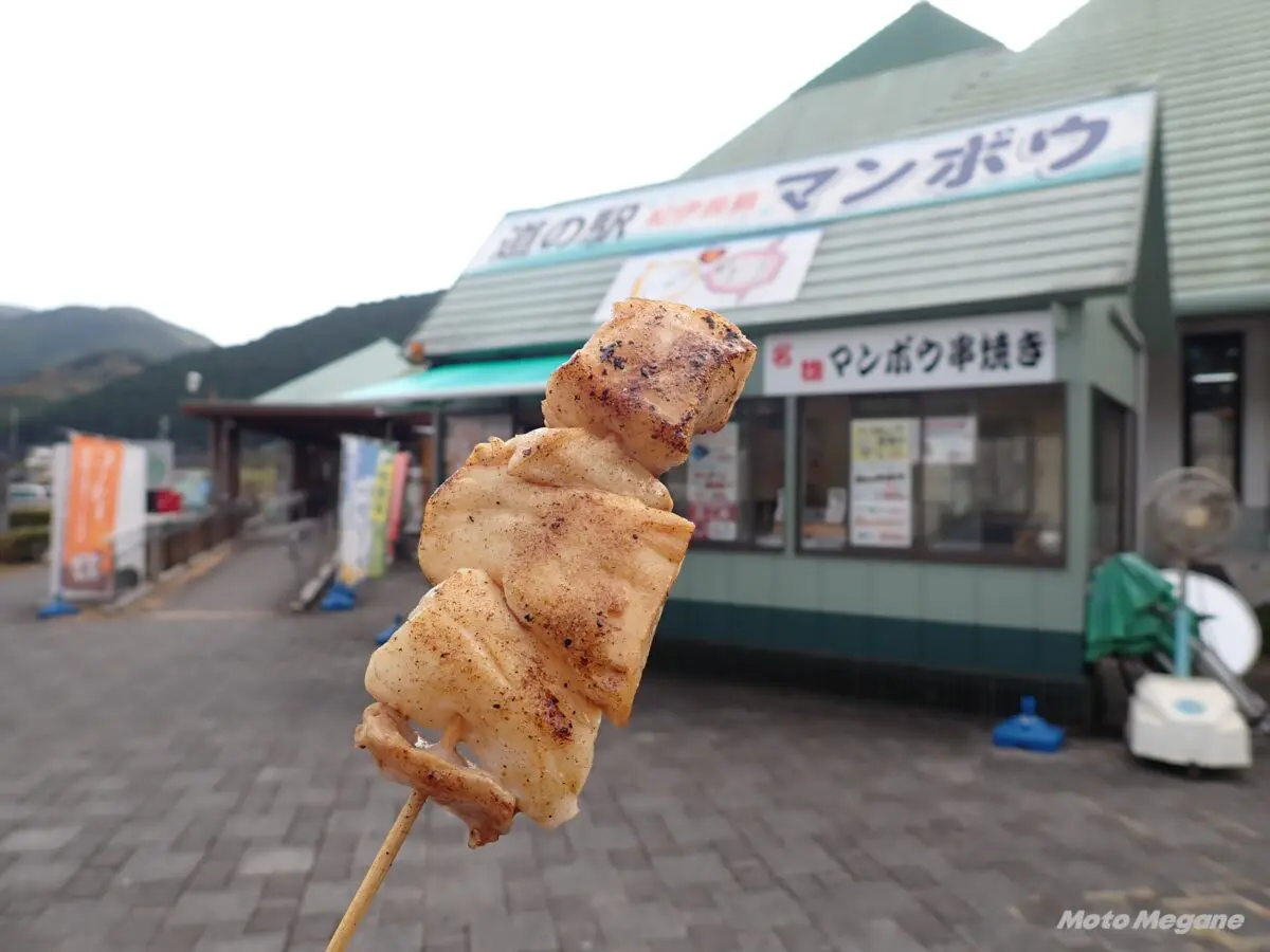 道の駅人気№1のマンボウの串焼き。口コミで少しずつ広がり、1日の最高売上本数が1000本を記録したこともある道の駅の名物メニュー。マンボウは淡泊な味わいの白身魚で、プリッとした弾力のある食感。鮮度が落ちると臭みが出るため、現地でしか味わえない品だ。