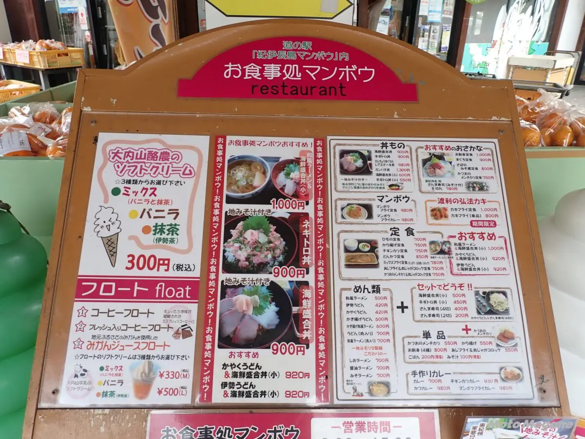 マンボウは紀北町の町の魚で、町では昔からマンボウを食用としていたそうだ。漁師が茹でたものを味噌和えや酢みそで食べていたというのが始まりで、今でも定番の食べ方だそう。物産館では冷凍のマンボウ白身や、マンボウ唐揚げ、マンボウのスタミナ焼き、マンボウみりん干しなど、多彩なマンボウ商品を揃えている。マンボウの加工品は、翻車魚(まんぼう)カレーやマンボウあられ珍しいものも。