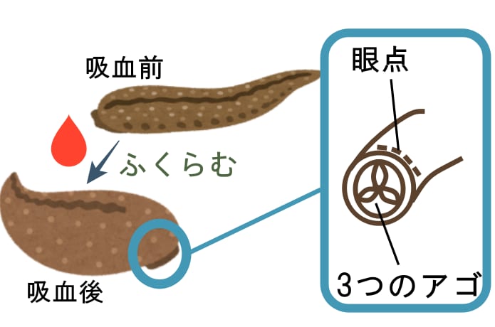 ヤマビルは足元から静かに忍び寄り、皮膚の柔らかいところを3つのアゴで削るようにして傷つけます。そして出てきた血を飲み、吸血後はぷっくりと膨れるのが特徴です。