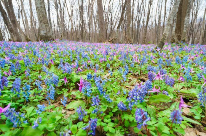 北海道旭川市と上川郡比布町にまたがる突哨山(とっしょうざん)は、日本国内最大級のカタクリ群落が広がることで有名です。散策路は1時間30分程度、一緒にエンゴサクも咲き誇り、紫と水色の水彩画のような風景が楽しめます。