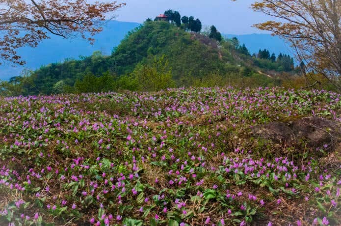 新潟県南魚沼の坂戸山は、山頂から山全体に戦国時代の城跡や遺構が見られる歴史の山です。カタクリの花は山麓から山頂まで登山道脇で見られ、ほかにイチゲ、エンゴサク、イワカガミなどの春の花もいっしょに観賞できます。