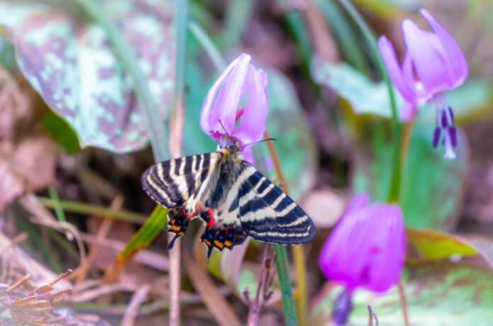 一緒に “春の女神” と呼ばれる蝶の「ギフチョウ」も見ることができ、“春の妖精と女神”の競演を楽しめます。